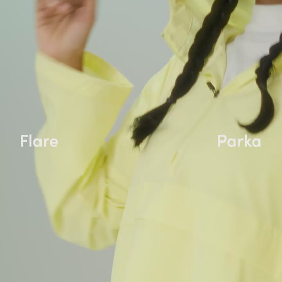 Breeze through your day in style with our oversized Flare Parka, designed for comfort, movement, and a touch of flair. The lightweight, breathable fabric and airy feminine flare silhouette make it perfect for all-day wear, while the high-low cut adds extra coverage. Featuring a stand collar, roomy hoodie, hidden zippered side pockets, and adjustable cuffs for a custom fit. Complete with mesh back ventilation to keep you cool and an embroidered logo on the chest.